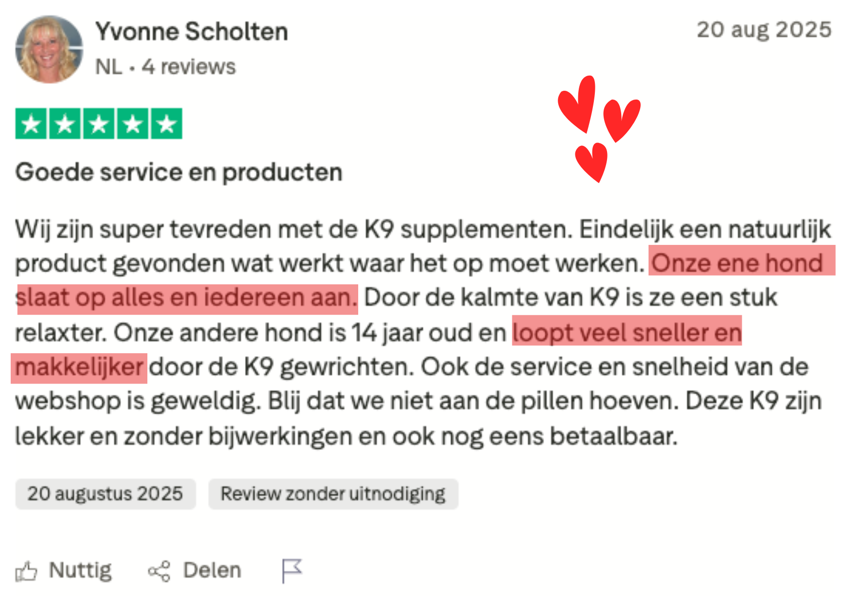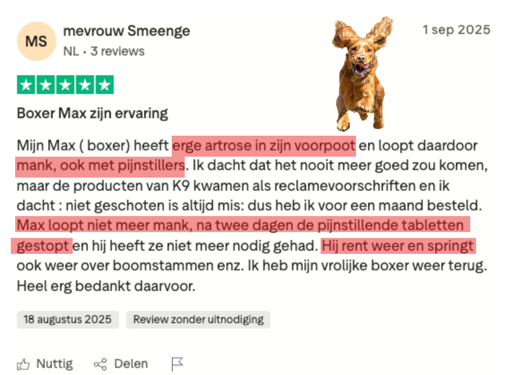 “Hele fijne snoepjes voor onze hond met heupdysplasie. Makkelijk te doseren en onze hond is er gek op. Ze loopt sinds ze deze snoepjes krijgt, ook veel minder stijf! Opvallend.
