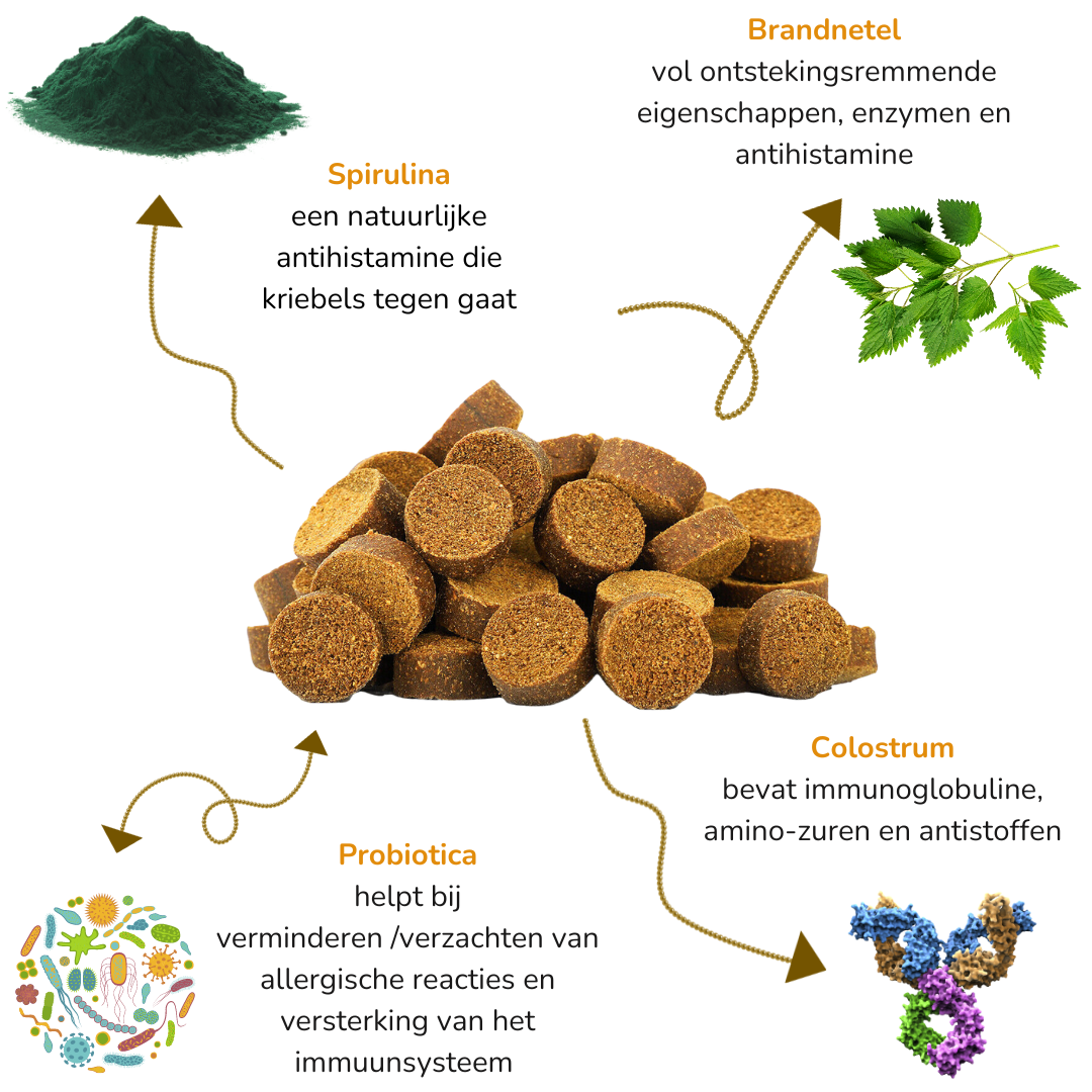 Colostrum 150 mg, Antioxidant immuniteits mix (spirulina, zoetwateralg, brandnetel, quercetine, bromelain) 50mg, Omega 3 visolie mix (zalmolie van wilde Alaska zalm, Omega 3 visolie) 50mg, appelciderzijn 50mg, biergist 50mg, Vitamine C 12,5 mg, Prebiotica & probiotica mix (L. Plantarum, L. Brevis, L. lactis, L. Acidophilus, L. Fermentum) 300 m CFU.