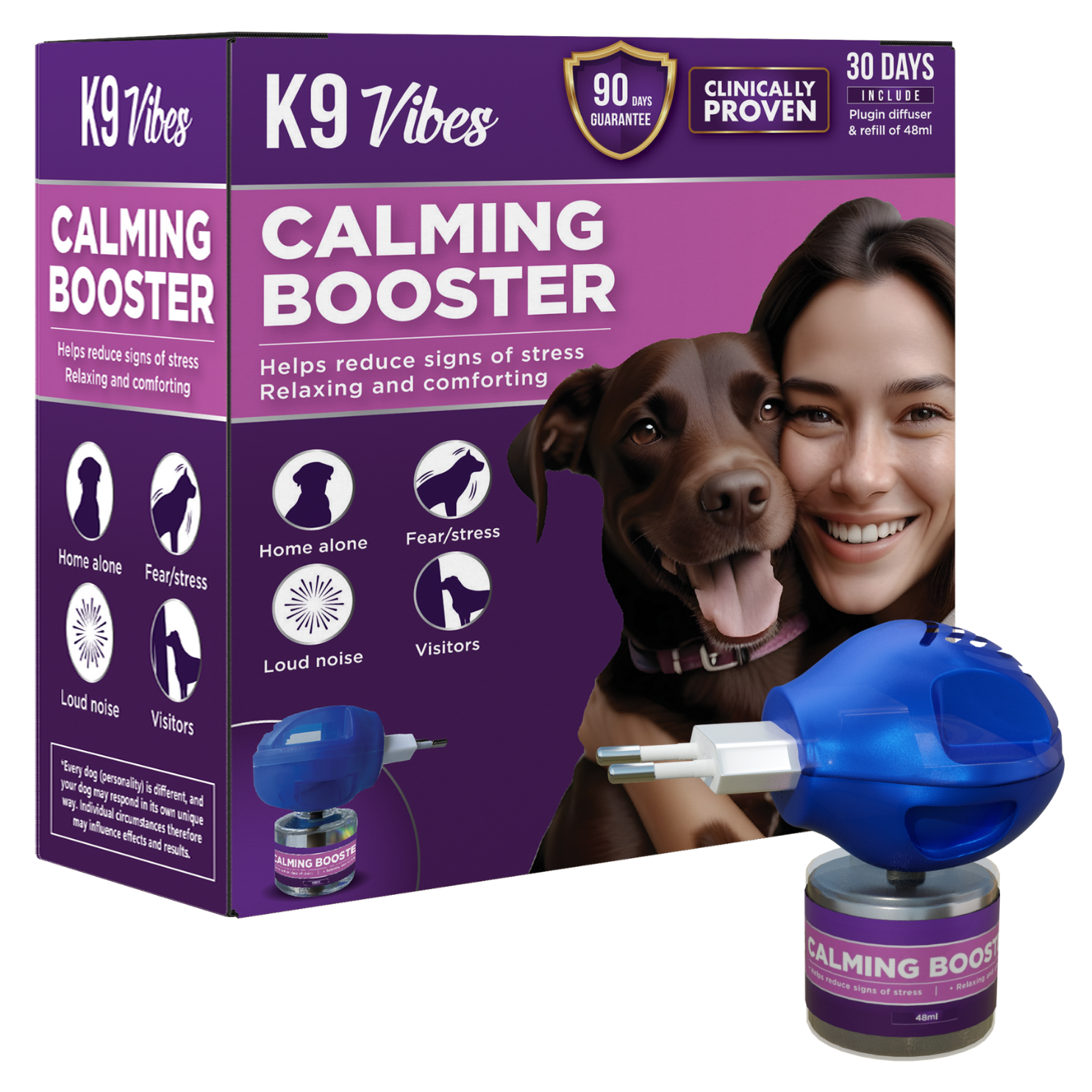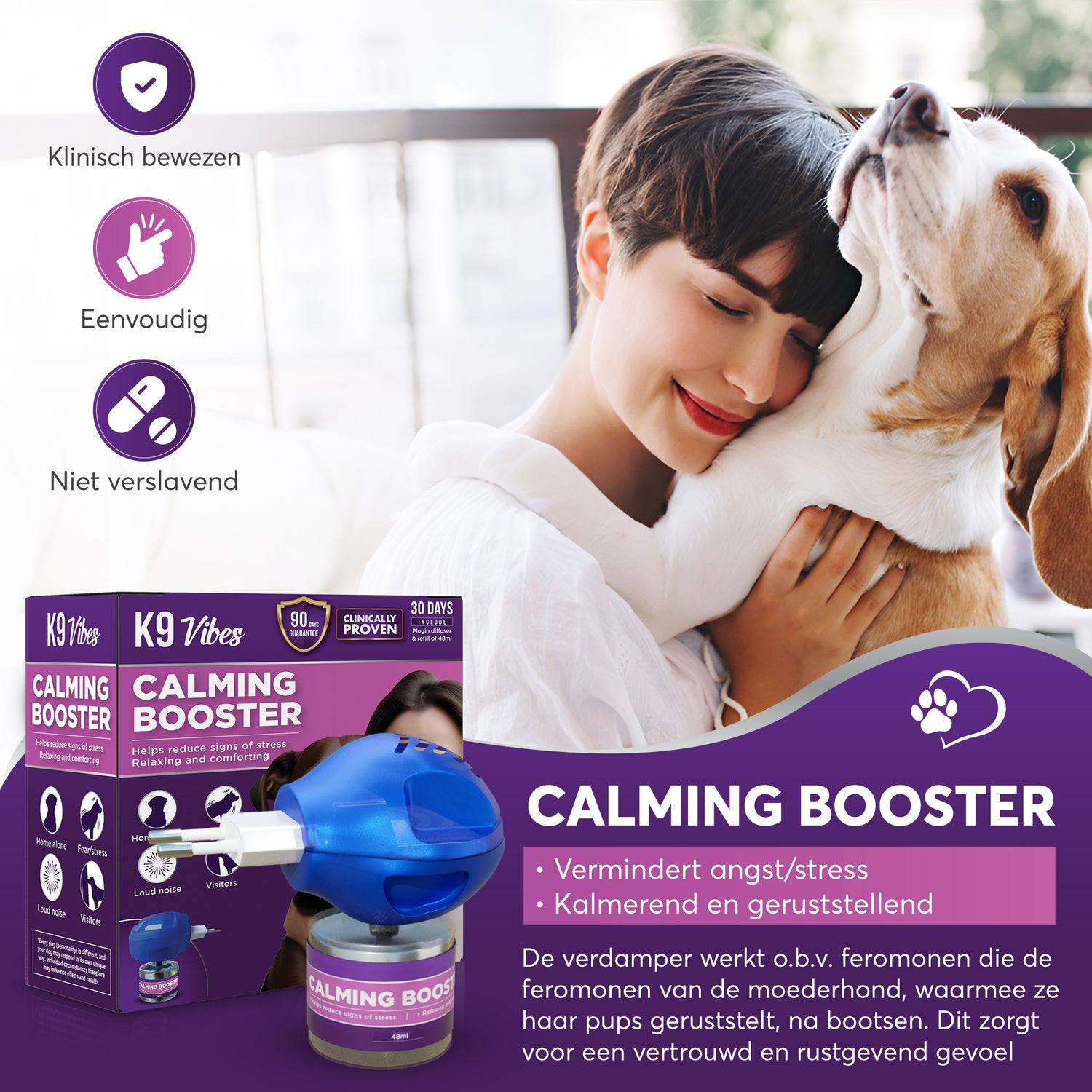 De K9 Calming Booster bevat een kopie van het 'moederferomoon'. Dit is het feromoon dat een moederhond aan haar pups afgeeft om een gevoel van veiligheid en binding te creëren. Bij volwassen honden zorgt het voor meer rust en kalmte in stressvolle situaties.