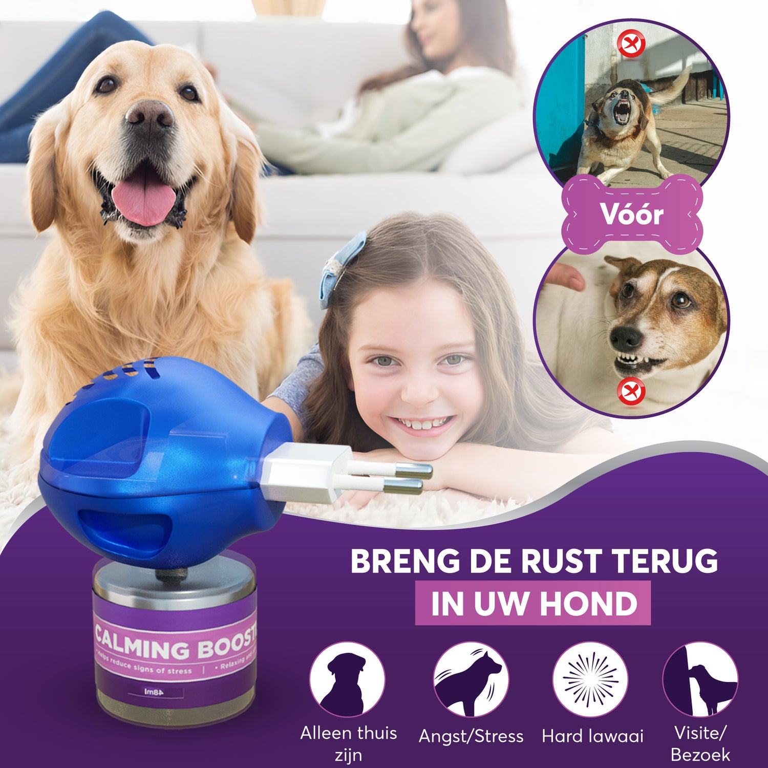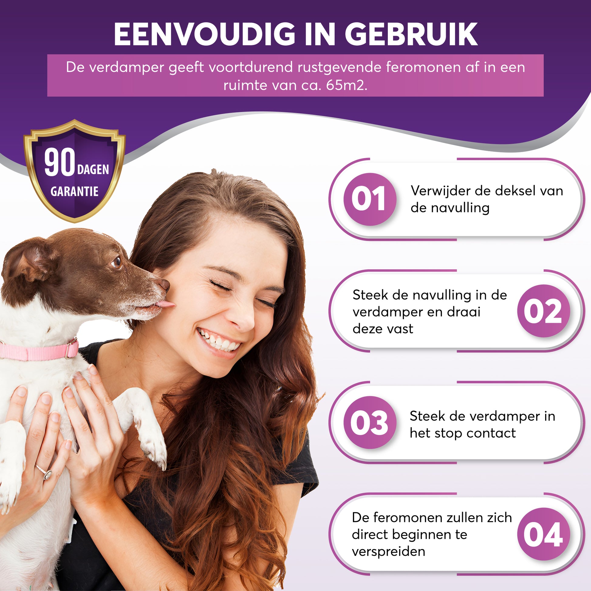 - Urgentie: Is de stress van uw hond zeer intens? Combineer de verdamper dan met de Calming Complex chews of het Kalm aan poeder voor ondersteuning van binnenuit.