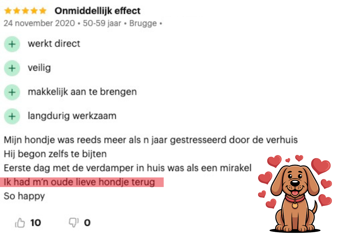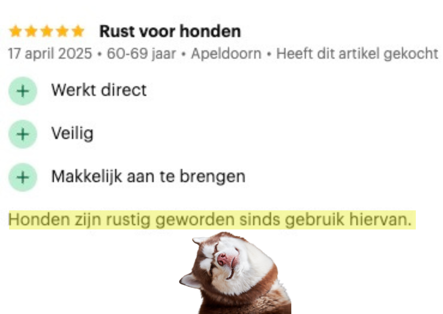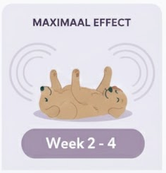 Ca. 70% afname van angst/stress gerelateerd gedrag merkbaar binnen 2-4 weken.