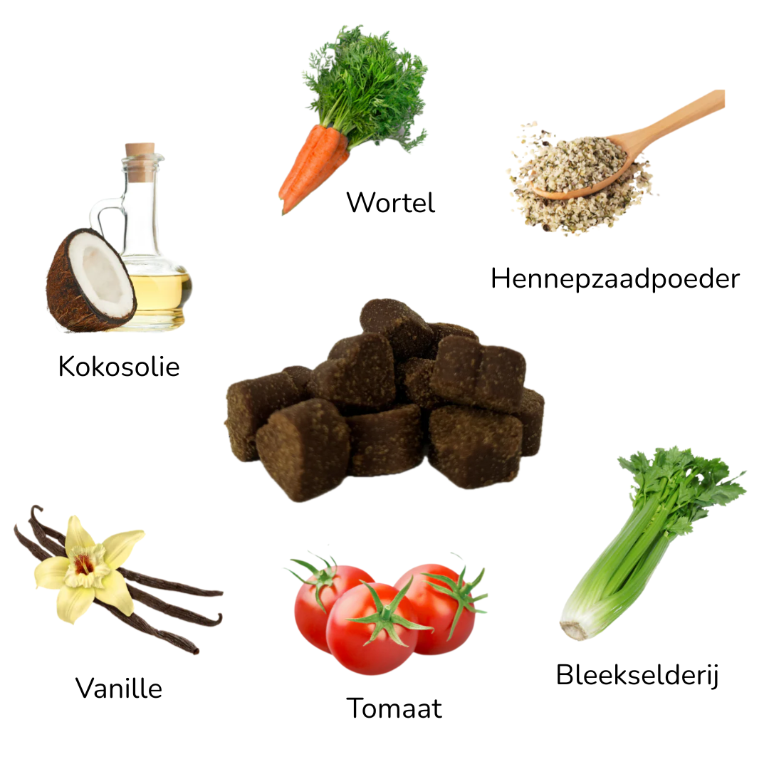Kokosolie, Knoflookpoeder, Hennepzaadolie, Hennepzaadpoeder, Brouwersgist, Appelazijn, Vitamine B1, Vitamine B6, Vitamine B12, Lijnzaad, Kippeneleverpoeder, Runderbeenmeel, Bietenpulp, Tapiocazetmeel, Vanille, Wortel, Tomaat, Kaliumsorbaat, Bleekselderij, Komkommer, Citrusvruchten, Gemengde tocoferolen, eendensmaak, Zonnebloemlecithine.