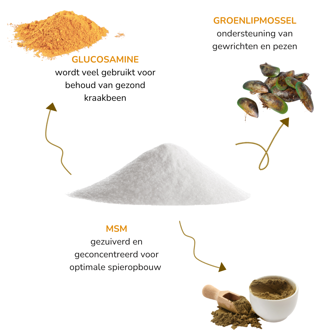 Dog Mobility Powder: Dit supplement is puur en bevat geen toegevoegde smaakstoffen of bindmiddelen, wat het ideaal maakt voor honden met speciale dieetbehoeften, zoals diabetes of allergieën. Het poeder kan gemakkelijk door het voer gemengd worden, waardoor je de dosis goed kunt afstemmen op de behoeften van je hond. Het bevat werkzame stoffen zoals glucosamine, chondroitine, MSM, groenlipmossel en hyaluronzuur, die allemaal bijdragen aan gezonde gewrichten en een soepele beweging.