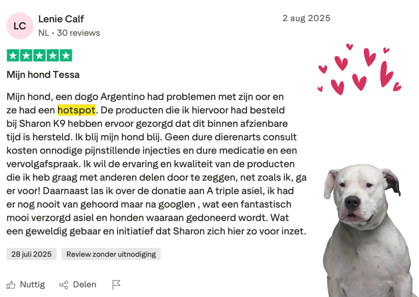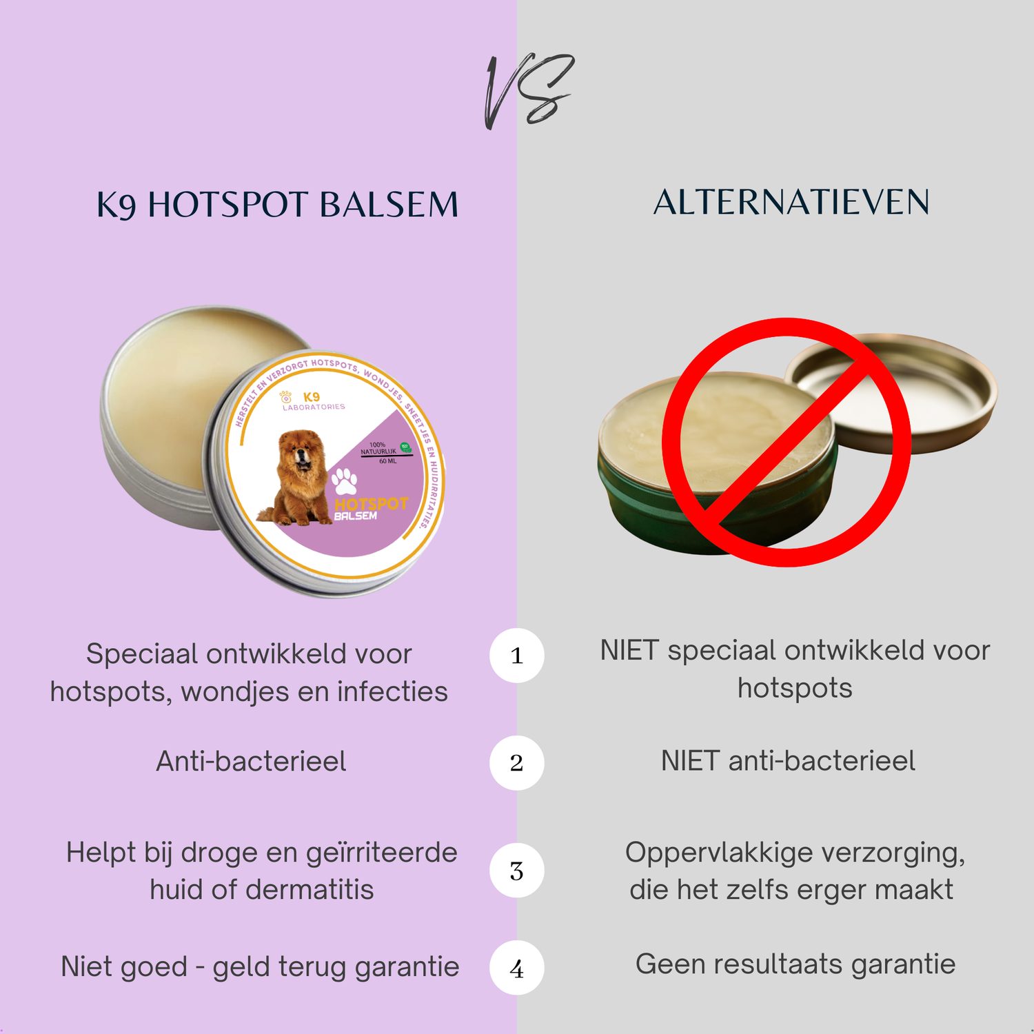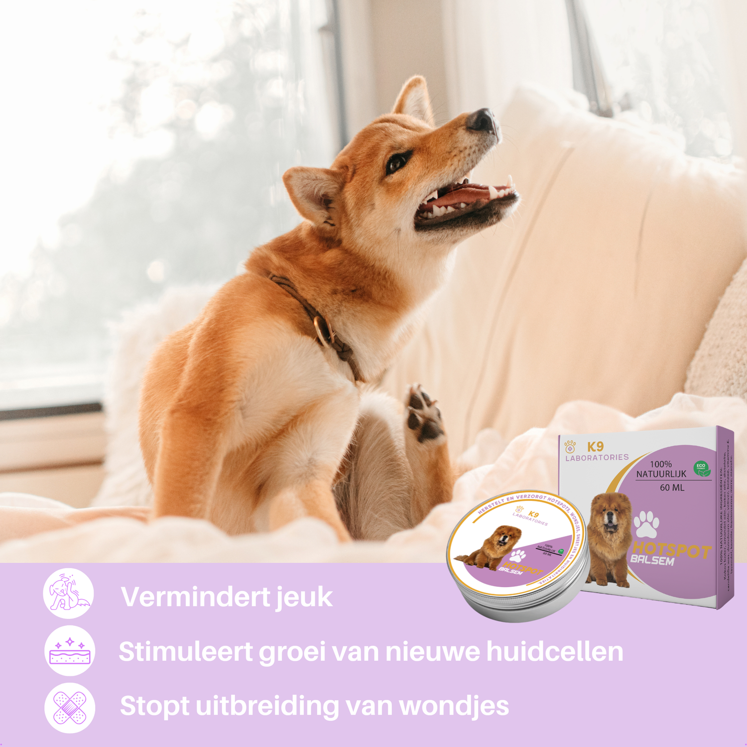 ONDERNEEM ACTIE: De Hotspot Balsem van K9 Laboratories is speciaal hiervoor ontwikkeld. In plaats van de huid af te sluiten, helpt dit botanische schild de plek direct te zuiveren en in te drogen. Door slechts 2 keer per dag te smeren, wordt de vicieuze cirkel van jeuk en uitbreiding doorbroken.