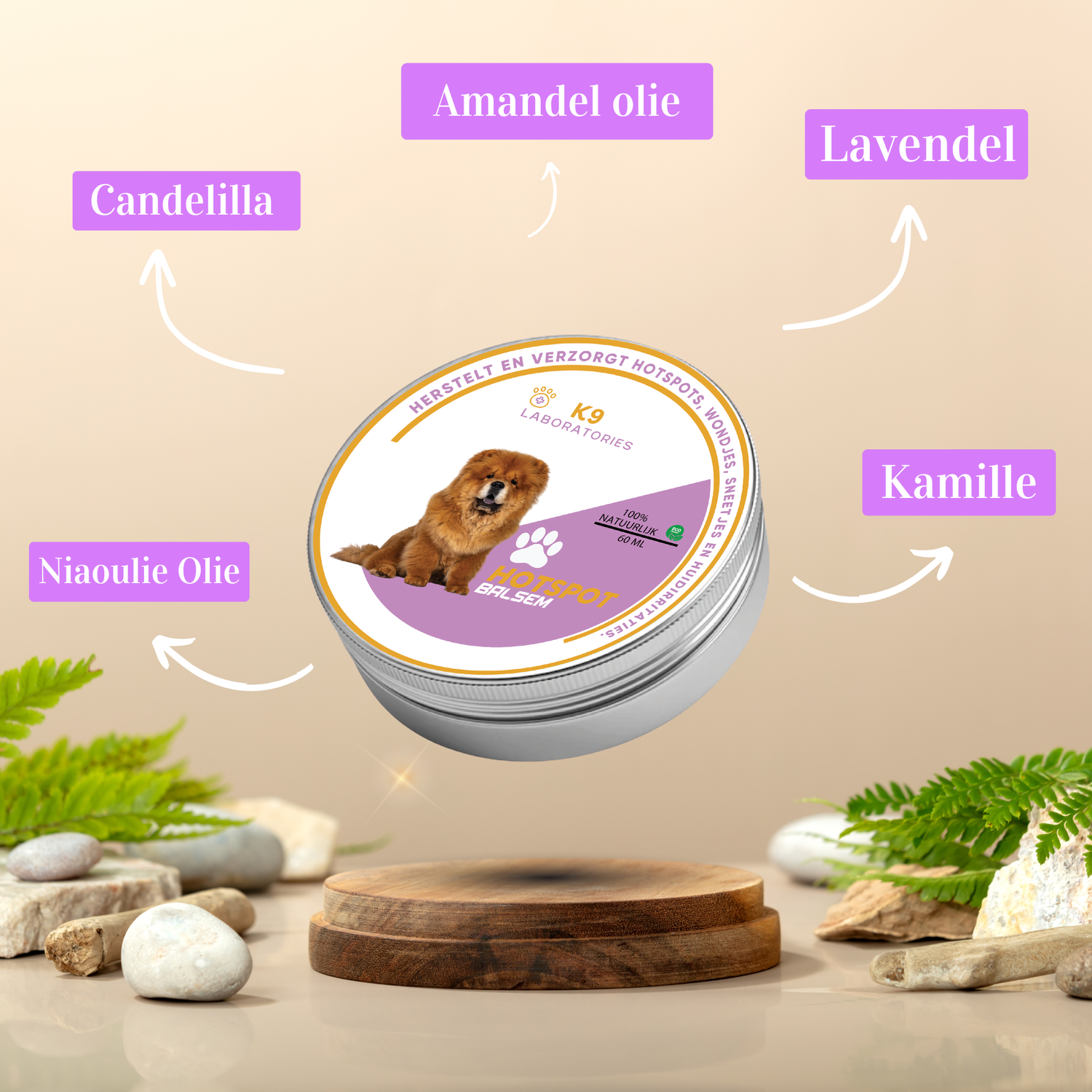 Onze Hotspot Balsem is een puur botanisch product, vrij van steroïden, antibiotica of chemische pijnstillers. Omdat honden instinctief aan geïrriteerde plekken likken, is onze formule onschadelijk. Sterker nog: de subtiele, natuurlijke geur van Niaouli en Frankincense helpt vaak om de lik-drang te verminderen, waardoor de balsem de tijd krijgt om zijn werk te doen zonder dat een hondenkraag gebruikt hoeft te worden.