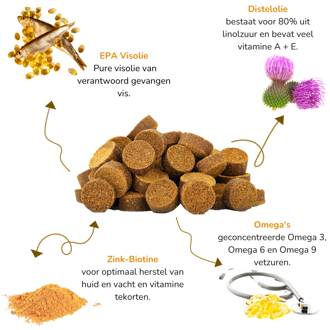 Omega-3 vetzuren, Omega-6 vetzuren, Omega-9 vetzuren, EPA-visolie, DHA-visolie, vitamine C, vitamine E, zink, biotine.